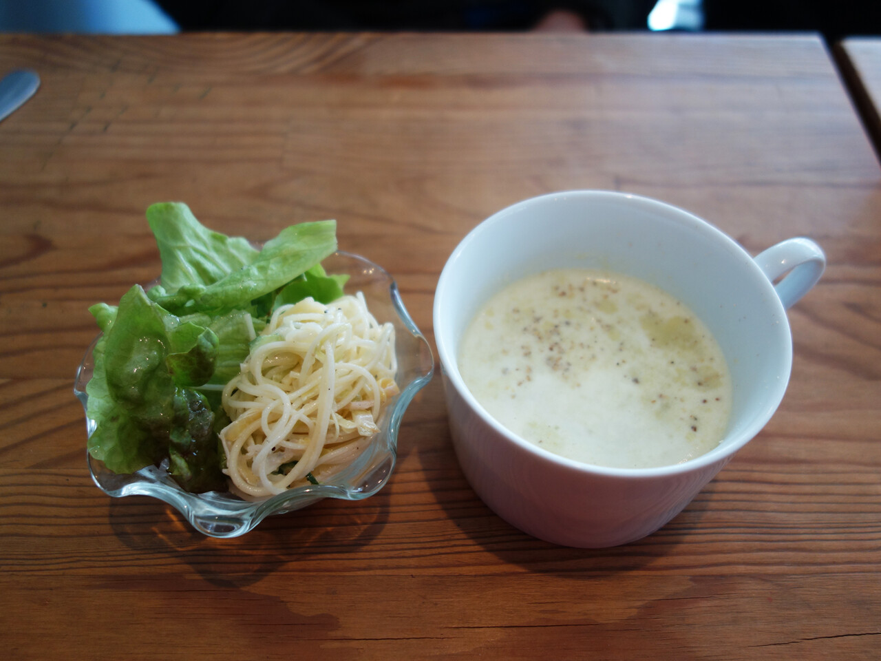 自家製えんどうまめスープとスパゲティサラダも付いています。