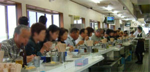 ベルトコンベア式に皆一斉に横にお尻をずらしていくシステム。