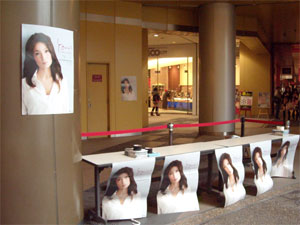 :リバーウォーク北九州の噴水のある中央広場で、あのマルシアさんの新曲キャンペーンライブ準備中。