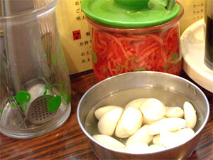 卓上には紅ショウガとスリゴマとニンニクとニンニククラッシャー