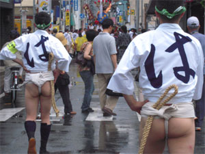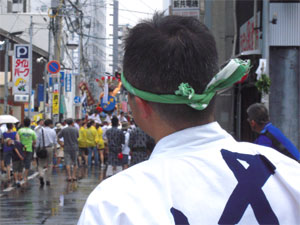 車から流し撮りした博多祇園山笠の男衆の画像。