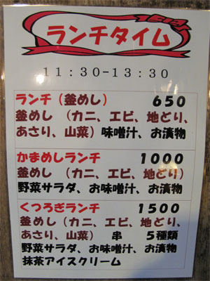 エビ釜めし・カニ釜めし・あさり釜めし・地鶏釜めしから選べます。