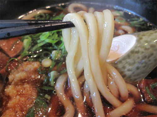 旨濃いおつゆで少し煮込まれて、うどんの表面に味が染み込んでます。