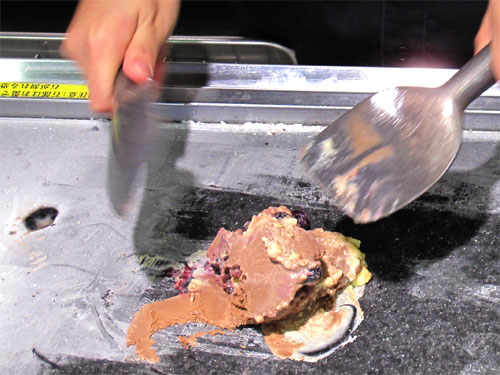 の大理石の上でアイスクリームと季節のフルーツや本格ドルチェを混ぜ合わせる