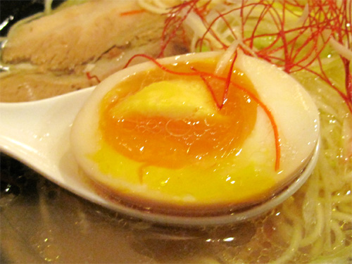 叉焼に白髪ネギや半熟玉子、糸唐辛子がトッピングされてます。
