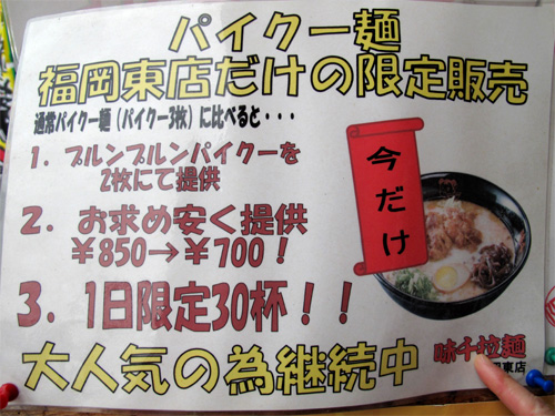 アタシは福岡東店限定の特価パイクー麺700円にしました。