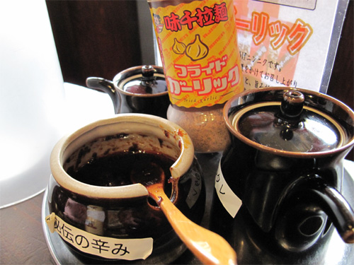 コショウやフライドガーリック、秘伝辛みそが置いてあります。