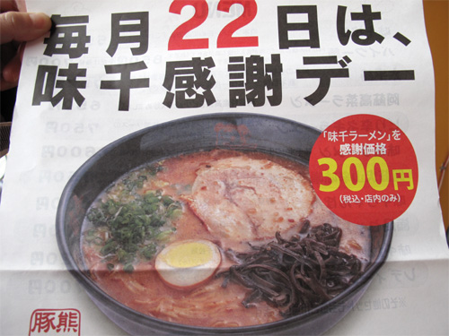 毎月22日は味千ラーメン550円が300円で食べられるサービスデーだそうです。