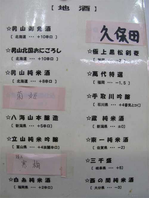 先日の夜訪問のときに、撮り損ねた日本酒のメニューをアップ。