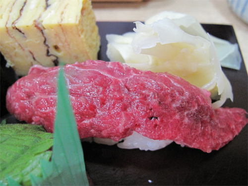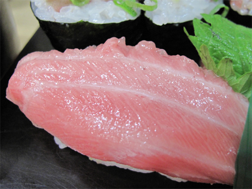 赤身が二貫(一貫は大葉が巻いてある)、中とろが三貫、