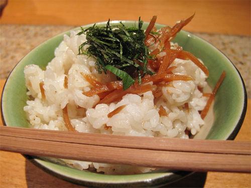 鶏皮ゴボウご飯200円。