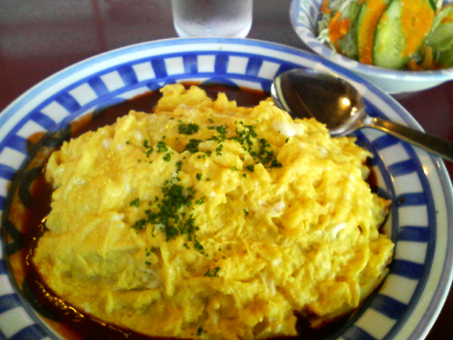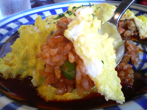 ケチャ&デミな味のライスにタマゴ焼きをかぶせ、