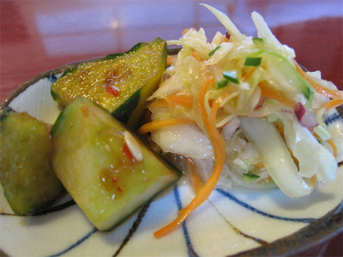 今回のお惣菜は、キャベツのコールスローみたいなのと、キュウリの醤油漬けでした。
