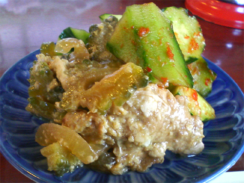 キュウリの浅漬けとキムチ漬けとゴーヤのタマゴ入りチャンプルー。
