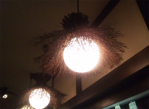 ミノカサみたいな民芸調照明カバーが面白い。