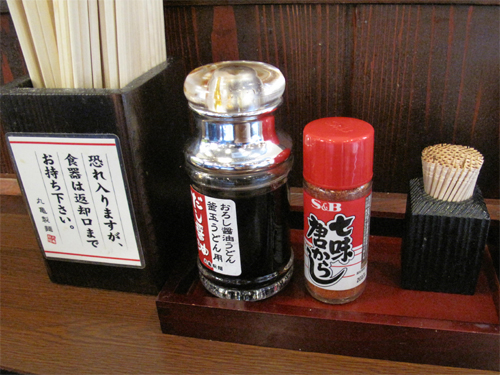 卓上には、ぶっかけうどん用の醤油と七味唐辛子。