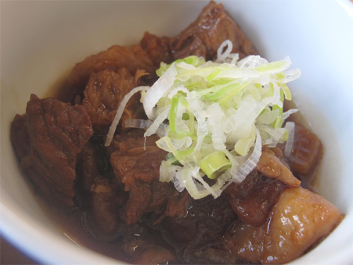 田舎風に甘辛く煮込んである、ぷるぷる牛すじ煮込みで
