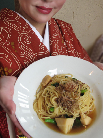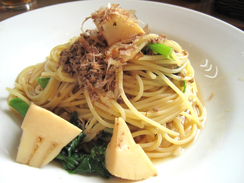 その名の通り、ひき肉と筍と菜の花の煮びたし風、和風つゆ仕立てのパスタです。