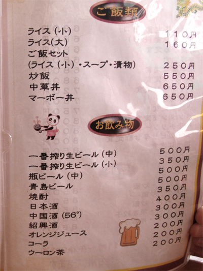 ラーメン550円・チャンポン600円・焼きそば680円・タンタン麺680円です。