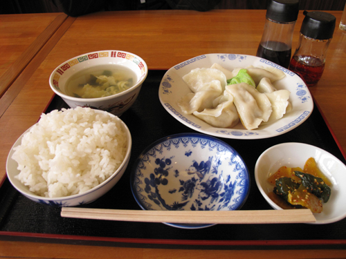 水餃子に白ご飯・スープ・漬物が付いてます。