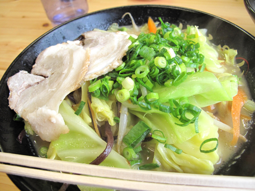 肉なしの野菜炒めがたっぷり乗ったラーメンです。