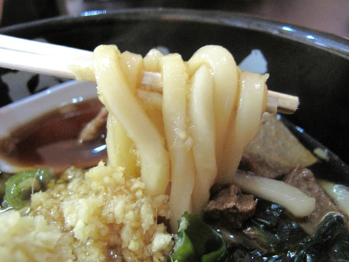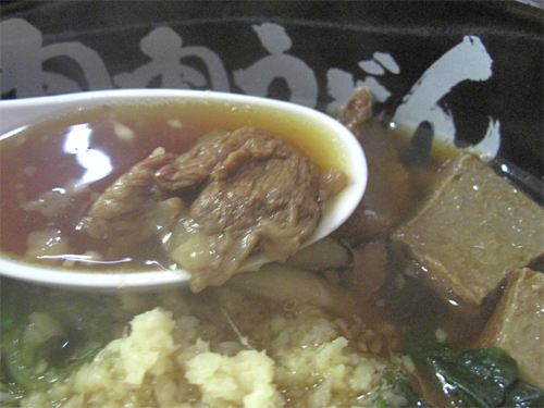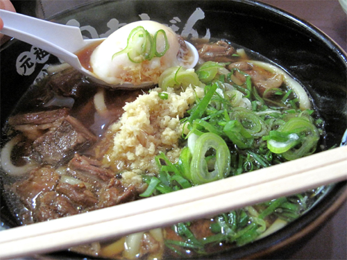 柔らかく煮込んだ牛肉の角切りと黒いつゆが特徴です。