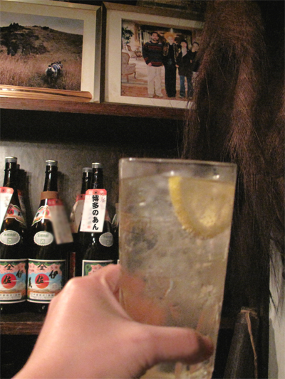 カウンター横の棚には、プレミアム焼酎の元祖・伊佐美のキープボトルがズラリ。