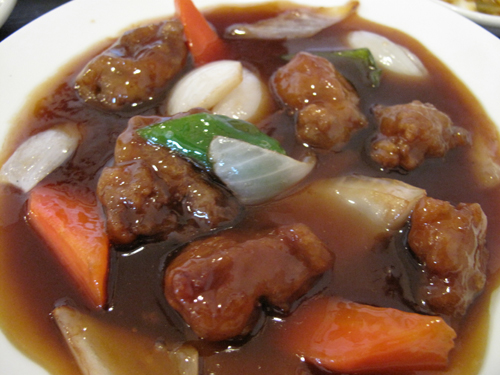 醤油味の甘酢あんに浮かぶ酢豚の具。