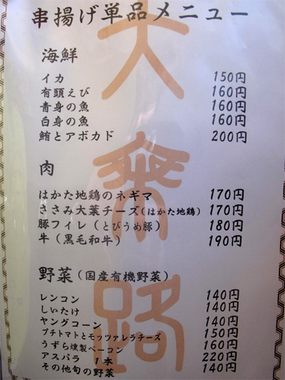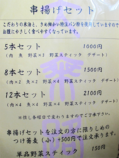 参考までに、夜の串揚げメニューです。
