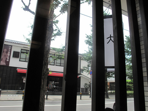 格子窓から、博多織や博多人形などが展示してある『はかた伝統工芸館』が見えます。