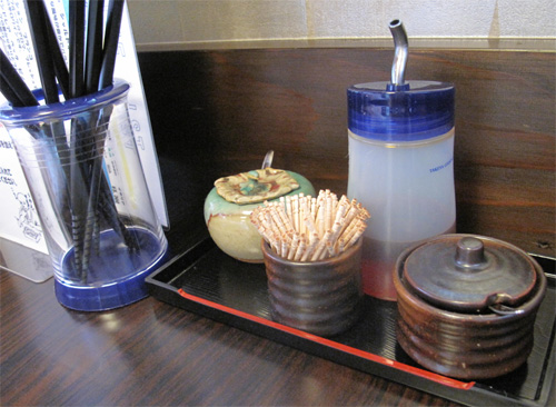 つけ蕎麦用の柚子胡椒・一味・ラー油など。