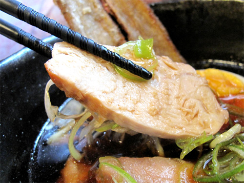 炙ったはかた地鶏のそぎ切り・揚げゴボウ・半熟玉子半個が入ってます。