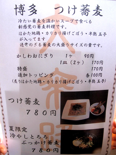 博多つけ蕎麦のメニューです。