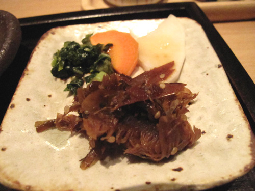 箸休めの佃煮風と野菜の漬物。