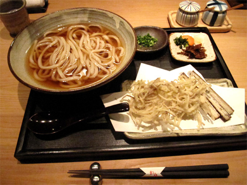 基本の素うどん(温)500円に、トッピング単品のごぼう揚げ350円を足したものです。