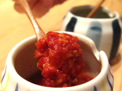 うどんが供されるときに、冷蔵管理した辛味調味料を持ってきてくれます。