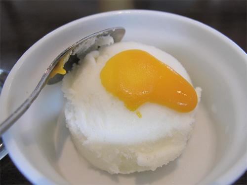 ヨーグルト風味のシャーベットにマンゴーソースがかかったもの。