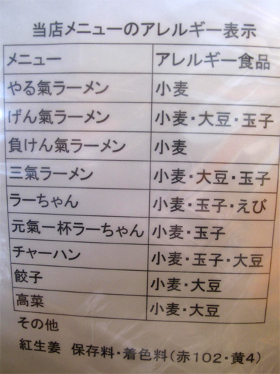 メニューのアレルギー成分を表示してあります。