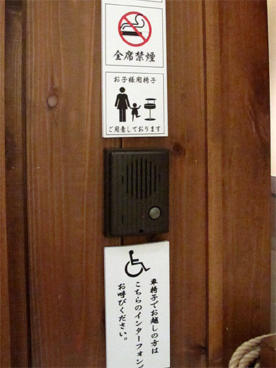 全席禁煙・お子様用椅子完備・車椅子誘導の案内表示。