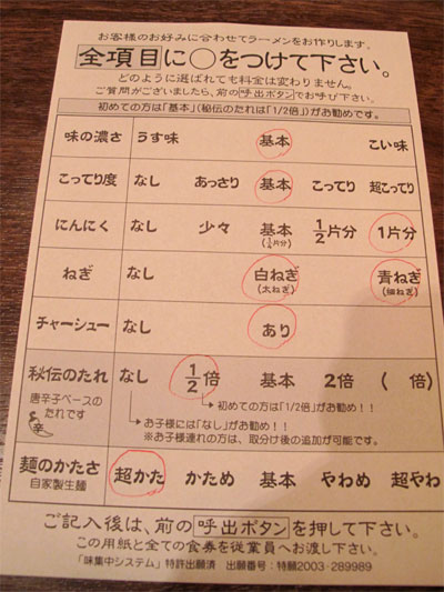 卓上のラーメン注文用紙に記入。