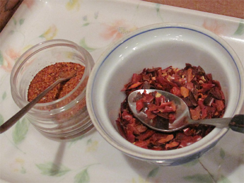 甘みもあるあっさり醤油味には唐辛子も合います。