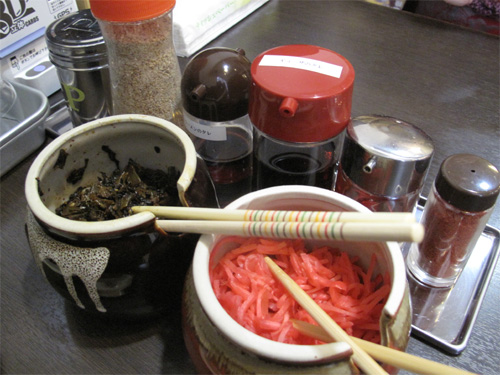 卓上には紅しょうが・辛子高菜・ゴマ・コショウ・ラーメンダレがあります。