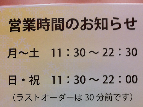 【営業】[月〜土]11:30〜22:30(L.O.22:00) [日祝]11:30〜22:00(L.O.21:00) ※要確認