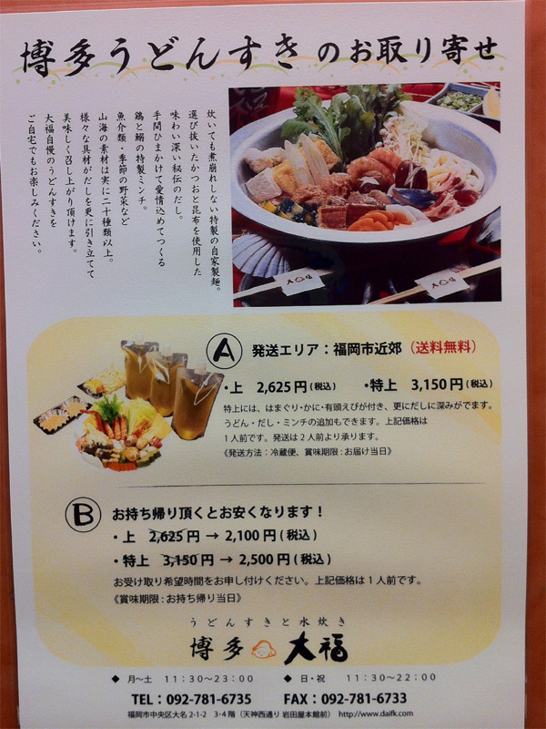 1. 天神・西通りエリアで名物の博多うどんすき♪@博多大福本店 [ 博多女のB級グルメ節。 ] 2012年06月08日 10:17