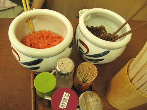 卓上には紅しょうが・辛子高菜・コショウなど。