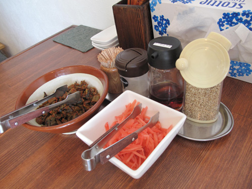 卓上にはスリゴマやコショウの他、取り放題の紅しょうがと辛子高菜。
