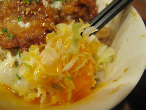 小さめの丼に白ご飯・キャベツの千切り・唐揚げ3個・温泉卵。