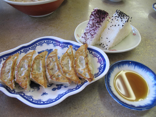 大きめのおにぎり2個と一口餃子より大きめの餃子が6個です。
