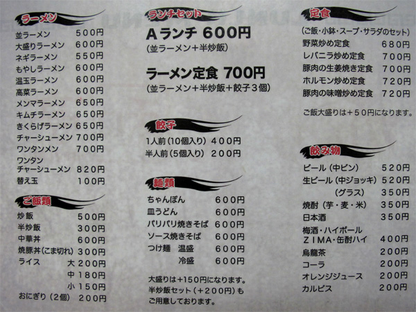 ラーメン+半炒飯600円の定食もありますが、