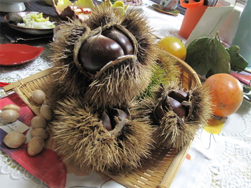 テーブルの中央には、ご自宅の柿や栗や銀杏のディスプレイ。